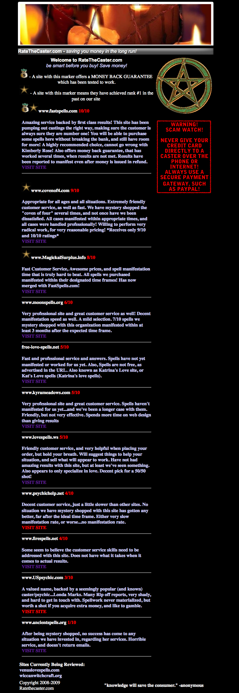 Update: After posting this article, and several thousand people reading it, all the websites listed here have now disappeared. I have collected and compiled screen captures of most of them however, and you can still see what they look like. Most are interspersed within these two articles, but the following are the most important: FastSpells.com's Homepage, FastSpells.com's Health Spell Section, and the page for RateTheCaster.com. As I piece together more screen grabs, they will be listed here as well.